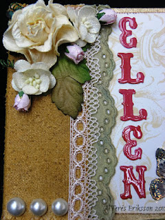 | Pärmen är målad med akrylguldfärg, likaså kanten på chipboarden. Bomullsspetsen är infärgad med distresser och Perfect Pearl. Den rosa spetsen uppe på har jag fått av Ulle som fick albumet! |
